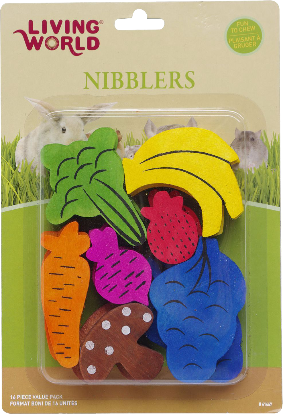 The Living World Nibblers Food/Veggie Mix Wood Chews includes 16 fruit and vegetable wood chews which are?fun for your small pet to chew on and are an excellent boredom buster.