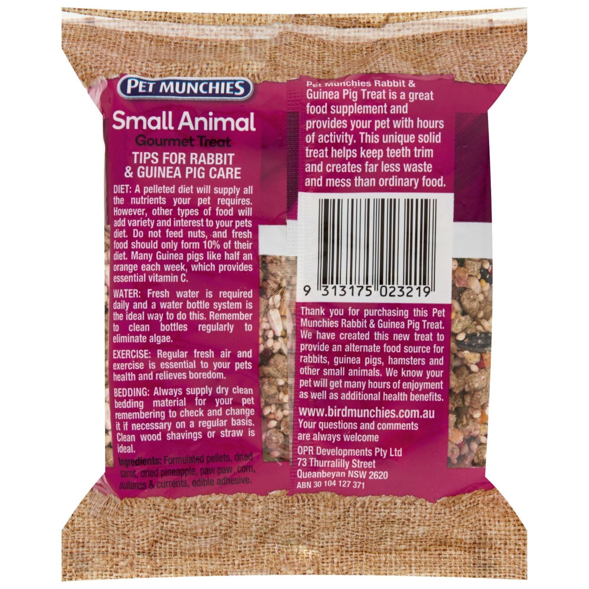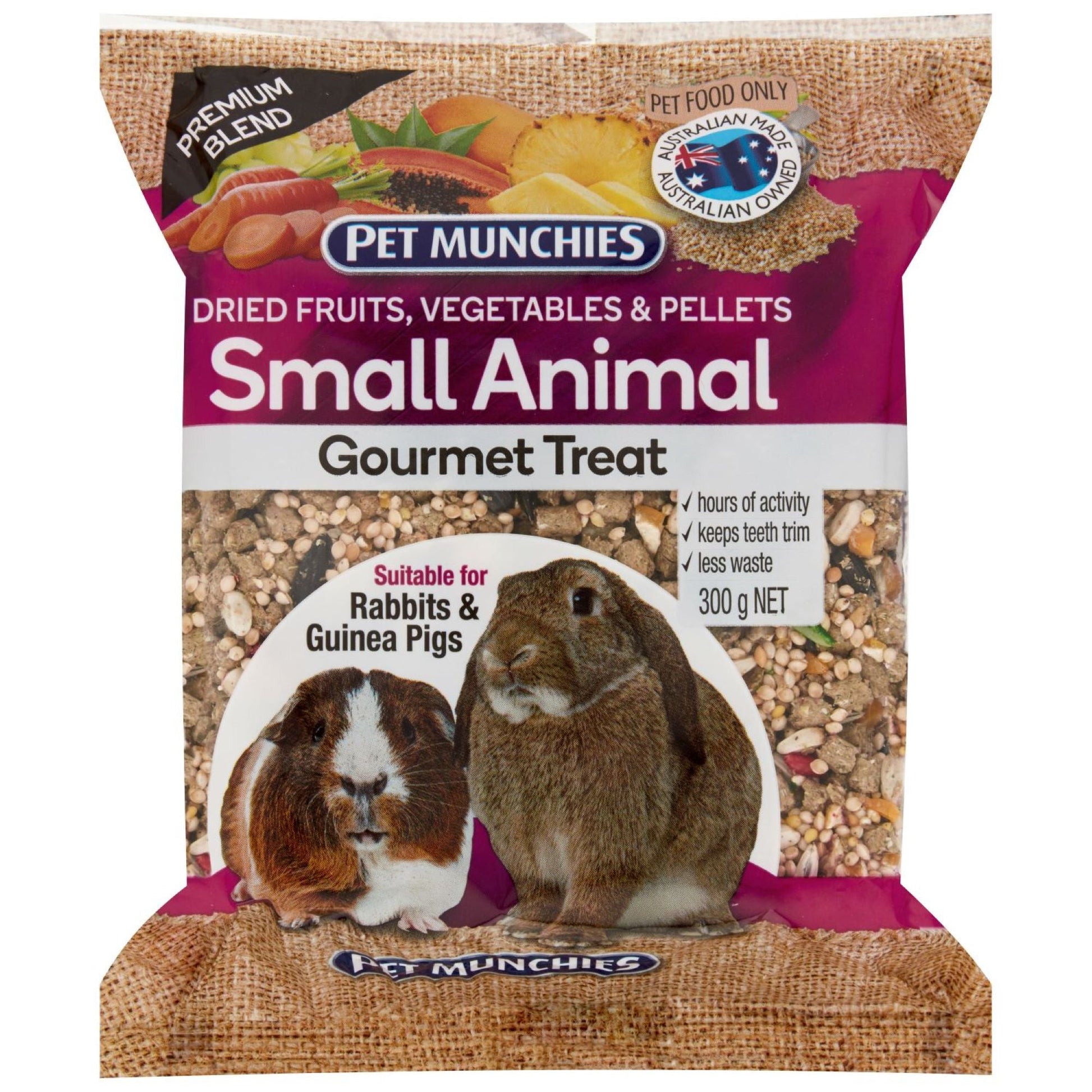 Pet Munchies Small Animal Gourmet Treat 300g is a great food supplement and provides your pet with hours of activity. This unique solid treat helps keep teeth trim and creates far less waste and mess than ordinary food.